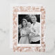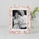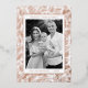 Modern foil holiday card featuring your photo framed in white with a rose gold foil dashed geometric pattern. Personalise the front with your custom holiday greeting, family name, and year in bold rose gold lettering. The back of this unique Christmas card includes space for your personal message in black lettering on a white background.