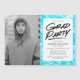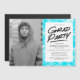 Trendy, modern graduation party magnetic invitations featuring the graduate's vertical senior photo and graduation party details with a background of turquoise and white dashed brushstrokes.