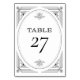 These glamourous black and white wedding table numbers feature a modern spin on classic art deco. An ornate, black geometric frame and ornamentation decorate an elegant white background for a dramatic, vintage wedding look.
