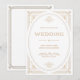 These glamourous wedding invitations feature a modern spin on classic art deco. An ornate, faux gold geometric frame and ornamentation decorate an elegant white background for a dramatic, vintage wedding look.