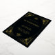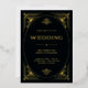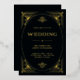 These glamourous gold foil wedding invitations feature a modern spin on classic art deco. An ornate, gold geometric frame and ornamentation decorate an elegant dark black background for a dramatic, glamourous and vintage 1920's wedding look.