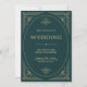 These glamourous wedding invitations feature a modern spin on classic art deco. An ornate, champagne gold look geometric frame and ornamentation decorate an elegant emerald green background for a dramatic, vintage wedding look.