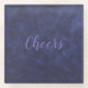 Modern and elegant deep blue bokeh design glass coaster with the text "cheers" in purple script handwriting. Easy to customise with your personal message. Text colour may be changed.