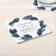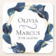Party Coasters | Modern Calligraphy with Deep Indigo Blue Leafy Foliage surrounds a gold multi-faceted frame - sparkles shine on the leaves. Bride and Groom names with wedding date. Design created for TheBarefootBride™ by © WhimsicalArtwork™. This is part of a wedding stationery suite collection with matching wedding accessories also baby shower and other occasion stationery. Feel free to contact us if you need assistance.