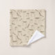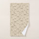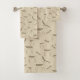 Modern illustrations of deer in repeat pattern on beige bathroom towel set.