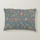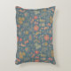 This throw pillow features stylised flowers in shades of coral and olive green on a denim blue background.