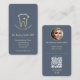The Elegant Modern Dentist Gold Tooth Light Blue Grey business card. With its stunning gold tooth logo, round photo, qr code, and customisable text in opulent gold, this card exudes elegance and refinement. The dark background accentuates the shimmering gold elements, creating a sense of luxury and exclusivity. Whether you're networking with high-end clients or building your brand, this card will make a lasting impression and set you apart from the competition. Let your business card speak volumes about your expertise and style with the Elegant MINIMALIST MODERN DENTIST GOLD TOOTH card.