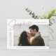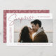 Share the news of your surprise engagement with these elegant photo engagement announcements. The design features the phrase "Surprise, we got engaged!" in a trendy desert rose script and modern lettering. Your engagement photo is featured in the centre-right part of the design with your names and engagement date displayed on the left. Personalise the surprise engagement announcement by adding additional details below such as wedding city/state, wedding website, etc. The announcement reverses to display a white foliage pattern on a desert rose-coloured background.