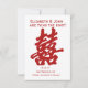This Modern Double Happiness Save the Date Card consists of the character "double happiness" in Chinese in red glitter, and customisable names, date and location.