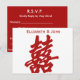This Modern Double Happiness Wedding RSVP consists of the character "Double Happiness" with the names of the bride and groom in the front. The back consists of RSVP information including names, acceptance, RSVP deadline and entree choice.