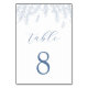 This charming table number features a whimsical cascade of fine blue botanical illustrations adorning the top, creating a lovely frame. The elegant script for the text beautifully complements the clean, bold numbering below. The crisp white background paired with the soft blue tones offers a fresh and airy feel, perfect for a sophisticated yet natural aesthetic.