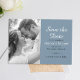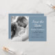 Announce your big day in style with this modern and elegant Save the Date invitation. This simple, minimalist Save the Date card is perfect for introducing your guests to your big day. Featuring a black and white photo of a romantic couple with script and classic typography in a dusty blue background you can personalised. This simple but pretty design is perfect to show off your sense of style and to let your friends and family know that you are getting married.
