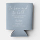 An elegant dusty blue wedding favour can cooler featuring stylish signature script names and special message and date set in modern typography. Designed by Thisisnotme©