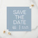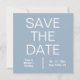 A modern save the date flat card in dusty blue. The square shape and simple typography create a minimalist and trendy aesthetic. Personalise the details on the front and back for your own custom announcement card.