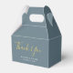 Surprise your wedding guests with these Modern Dusty Blue Wedding Thank You Script Favour Boxes. This simple design has "thank you" in faux gold handwritten script lettering on customisable trendy dusty blue background. Bride and groom's names are in simple print font followed by month, day and year of your wedding. Click the personalise template option and follow the prompts
