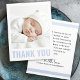 White or any colour thank you notecard with your photo and the text "thank you" in a modern sans serif font on the front. Customisable message on the back with light dusty blue borders top and bottom. You can change all colours, move and resize elements with the design tool.