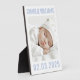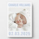 White or any colour photo plaque with the baby's name and birth date in a light dusty blue modern sans serif font. You can change all colours, move and resize elements with the design tool.