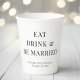 Modern paper cups for your wedding reception, rehearsal dinner, engagement party, and other wedding celebrations featuring "Eat Drink & Be Married," your names and your wedding date in elegant typography.