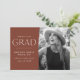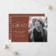 Celebrate your graduate's exciting milestone with these unique photo graduation announcements! The design features "congrats to our grad" in white modern lettering with a chestnut brown background with a torn edge bordering the graduate's senior photo. Personalise the announcement by adding the graduate's name, school name, and graduation year. The card reverses to display a textured brown and white striped pattern.