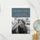 Modern graduation thank you card featuring "Thank You" at the top in white modern lettering with a slate-colored torn edge bordering the graduate's senior photo. Personalize the photo thank you card by adding the graduate's name, school name, and graduation year. The back of the card provides space for your typed or handwritten message.