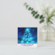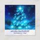 Business cards with a modern electric blue Christmas tree. Decorated with lights all around. The background has faded blurry lights.