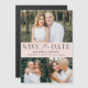 Announce your wedding date with this stylish, modern photo save the date magnet. The design features three of your favourite engagement photos with "Save the Date" displayed in black serif and script fonts against a blush pink background. Personalise the minimalist save the date magnet by adding your names, date, and wedding location. The simple save the date photo magnet is perfect for any wedding theme.