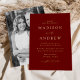 Minimalist, modern wedding invitation featuring your wedding details in gold foil lettering with calligraphy script accents. The burgundy background can be changed to a colour of your choice. The back of the foil wedding invitation displays your vertical engagement photo. Designed to coordinate with our Modern Elegance wedding collection.