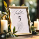 Elegant wedding seating chart featuring "table" displayed in black calligraphy script with the table number and guest names shown below on a cream background. The design repeats on the back. To order the table number seating chart, edit each card with the table number and guest names and add it to your cart. Designed to coordinate with our Modern Elegance wedding collection.