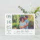 Modern and stylish wedding save the date announcement cards feature a horizontal engagement photo with a typographic design that includes bold and elegant wedding date numbers with a simple monogram of the bride and groom names. Rich emerald / forest green and white color scheme.