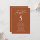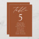 Elegant wedding seating chart featuring "table" displayed in white calligraphy script with the table number and guest names shown below on a terracotta background. The design repeats on the back. To order the table number seating chart, edit each card with the table number and guest names and add it to your cart. Designed to coordinate with our Modern Elegance wedding collection.