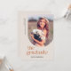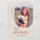 This modern graduation photo card features elegant typography and an off-centre, upside down arch photo frame. On the front, "The graduate" is written in a simple and trendy font below the photo. The graduate's name is centred underneath the typography, while the graduate's school and graduation year are written vertically along the left side of the photo. The typography is burnt orange and charcoal grey against a light peach background. The back of the graduation card includes an optional template to add graduation party details.