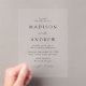 Discover the perfect balance of simplicity and sophistication with our Modern Elegance wedding invitations. Featuring your wedding details in black lettering with elegant calligraphy script accents, these invitations offer your choice of a frosted or transparent acrylic background. Ideal for couples seeking a sleek, minimalist design, these modern wedding invitations exude understated elegance. Personalise them to reflect your unique style and set the perfect tone for your special day.