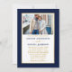 Modern Elegant Minimalist Photo Navy Blue and White Wedding Invitation. Gold Frame. Gold Script. Navy Blue and White Stripes on back.