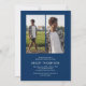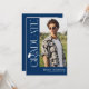 Celebrate your graduate in timeless, elegant style with this modern blue and white graduation invitation. Set against a stylish blue background, the design features trendy white serif “GRADUATE” typography running vertically down the side, creating a refined focal point. A stylish graduation cap icon sits above the “R,” while the flowing tail of the letter transforms into a sleek tassel—leading the eye to a standout photo of the graduate.