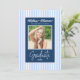 Celebrate your graduate in style with this elegant blue and white graduation announcement card, featuring a classic script design, soft striped background, and a personalized photo of your graduate. Perfect for sharing this milestone moment with family and friends, this design blends timeless charm with a modern, preppy aesthetic. Ideal for high school, college, or university graduations.