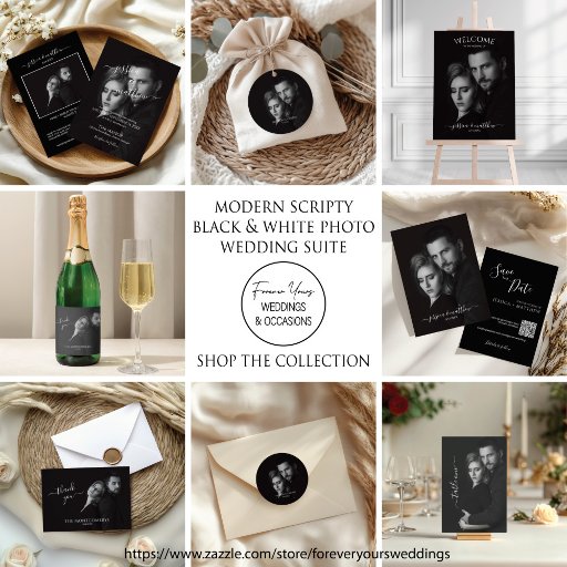 This elegant and timeless modern black-and-white wine label features a photo of the bride and groom. Its simple and classy design makes it suitable for any season. To personalise your card, simply click on "Personalise This Design," enter your information, and Zazzle will handle the rest. Complimentary items are also available. This card is part of the Modern Scripty Black and White Photo Wedding Suite.