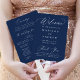 This elegant wedding program hand fan features graceful white calligraphy on a rich navy background, making it a stunning addition to your wedding day. Personalise the fan with your names, wedding date, location, and a heartfelt thank you message in bold white lettering. The reverse side offers ample space for your ceremony details and the names of your bridal party, adding a personal touch for your guests. With its modern, simple, and elegant design, this program hand fan is perfect for both formal and casual weddings in any season. Not only will it keep your guests cool, but it also serves as a beautiful keepsake from your special day.