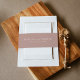 Elegant wedding invitation belly bands featuring your names separated by "and" displayed in a white calligraphy script on a dusty rose background. Personalise the modern wedding belly bands with your wedding date in italic lettering.