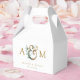 Stylish wedding favour box featuring a modern monogram and delicate eucalyptus illustration in soft beige and green on a crisp white background. Personalise with your names and wedding date for an elegant, coordinated touch to your celebration. Ideal for small gifts or treats for your guests.