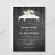 Unique tent wedding invitation features a graphic silhouetted wedding tent with a beautiful bouquet on top, hanging strings of light + boho arrows, + typography design against a chalkboard backdrop. The invitation features a formal and inviting tone, perfect for a romantic tent wedding setting.