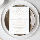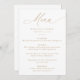 Enhance your wedding reception with this luxurious wedding menu, showcasing "Menu" in elegant gold calligraphy against a crisp white background. The modern, simple, and sophisticated design allows couples to personalise the menu with their names, wedding date, and meal details in bold gold lettering. Ideal for both formal and casual weddings, this menu exudes timeless elegance and complements any wedding theme. Whether you're hosting a grand celebration or an intimate affair, this stunning menu will elevate your reception, offering a refined and memorable touch to your special day.