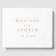 Elegant wedding guestbook featuring your names and wedding date in gold lettering on a white background. Personalize the spine of the simple wedding guest book with your married name and wedding date.