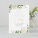 An elegant floral wedding invitation featuring white watercolor peonies and roses with greenery and modern delicate handwritten calligraphy.