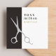 Elegant customizable business card template with FAUX silver scissors icon and dark grey/white stripes background. Modern cool design for hair salon, hairdresser, hair stylist.