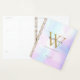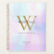 Modern elegant gold monogram name 2023 planner with a holographic, rainbow gradient, iridescent, pearl background.
