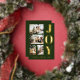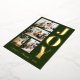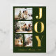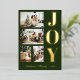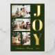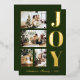 A modern and elegant Christmas greeting cards featuring four family Christmas photos, a thick bold gold foil lettering of "JOY" and a script gold foil lettering of your family name in dark green background