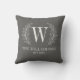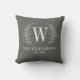 A modern monogram grey throw pillow with laurel leaves. Adds an elegant touch to your home decor. Personalise it with your Initial, name and wedding date. Comes in a variety of colours. Designed for you by blackberry Boulevard.