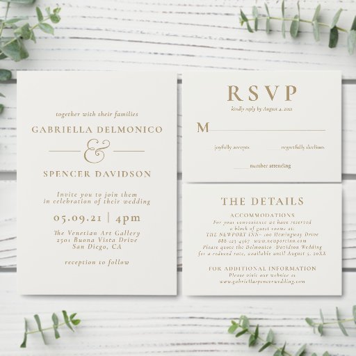 This elegant wedding invitation features a minimalist modern design in a light cream with real gold foil typography. The reverse side is a rich navy blue. Personalise with all of your important details including bride and groom name, wedding date, time and location.