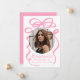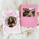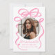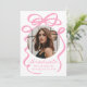 Celebrate your graduate’s big achievement with this stylish graduation announcement, featuring a bold pink bow and ribbon design on a white background. The graduate’s circular photo is beautifully framed by the bow, while "Graduate" shines in an elegant handwritten pink script. Personalise with the graduate’s name, school, and graduation year for a unique and timeless touch. The back includes an additional photo and space for a custom message, making this design perfect for high school and college graduates. Announce this special milestone with a chic and sophisticated keepsake!