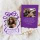 Celebrate your graduate’s achievement with this elegant graduation announcement, featuring a bold purple bow and ribbon design on a light purple background. The graduate’s circular photo is beautifully framed by the bow, while "Graduate" is showcased in a stylish handwritten purple script. Personalise with the graduate’s name, school, and graduation year for a unique and meaningful touch. The back includes an additional photo and space for a custom message, making this design perfect for high school and college graduates. Share this special milestone with a sophisticated and timeless keepsake!